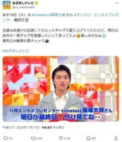 めざましテレビ公式X、timelesz篠塚大輝の「一発ギャグ」告知を削除 相次ぐ批判にフジ「今後の番組制作にいかし」