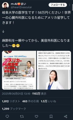 1: 2025/11/20(木) 20:50:13.64 岐阜大学の医学生です!58万円ください!世界一の心臓外科医になるためにアメリカ留学してきます!↓麻酔科を一瞬やってから、美容外科医になりました〜😁😁 pic.twitter.com/HrJppcJdxP— m-AI🍑まい (@heart2vascular) June 1, 2025 識者の見解 純情な支援者に詫びてクラウドファンディングで得たお金を返金しなさい。本当に心臓外科医を目指していたのなら、世界初の心臓移植を試みられた本物の一流心臓外科医だったクリスチャンバーナード先生すら、晩年は美容医療に参入し、詐欺師扱いされていたのをご存知のはずです。… — 高須克弥 (@katsuyatakasu) November 19, 2025 ※関連記事 【画像】この漫画の「ダメ人間」と付き合っている彼女の話、少し怖くて草wwwww…
