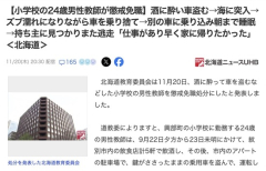 1 : 【小学校の24歳男性教師が懲戒免職】酒に酔い車盗む→海に突入→ズブ濡れになりながら車を乗り捨て→別の車に乗り込み朝まで睡眠→持ち主に見つかりまた逃走「仕事があり早く家に帰りたかった」<北海道> 道教委によりますと、興部町の小学校に勤務する24歳の男性教師は、9月22日夕方から23日未明にかけて、紋別市内の飲食店計5軒で飲酒し、その後、市内のアパートの駐車場で、鍵がささったままの乗用車を盗んで、運転しました。 その後、車を返そうとして、道に迷い、興部町の海水浴場の波打ち際に乗り上げ、車を水没させたまま、乗り捨てて逃走しました。 さらに「海水に全身が濡れて寒かった」との理由で、海水浴場の駐車場に停めてあった無施錠の別の乗用車に入り込み、朝まで仮眠。 その後、乗用車の持ち主に発見された際、再び逃走。 23日になって車を盗んだ疑いで警察に逮捕され、旭川地検が10月3日付で不起訴処分にしていました。 これを受け道教委は男性教師を20日付で懲戒免職処分にしました。 道教委の調べに対し男性教師は「仕事があり早く家に帰りたかった。子どもたちと保護者に大きな不安と失望を与えたことに心からおわびする」と話しているということです。 2 : いつもなら学校が庇ってくれるのになんでや…