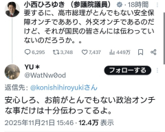 立憲・小西氏「高市総理がとんでもない外交オンチである事が国民の皆さんに伝わってないのだろうか」