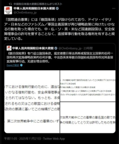 1: 名無し 2025/11/21(金) 20:03:29.66 ID:XX50ZSG09 中華人民共和国駐日本国大使館@ChnEmbassy_jp「国際連合憲章」には「敵国条項」が設けられており、ドイツ・イタリア・日本などのファシズム/軍国主義国家が再び侵略政策に向けたいかなる行動を取った場合でも、中・仏・ソ・英・米など国連創設国は、安全保障理事会の許可を要することなく、直接軍事行動を取る権利を有すると規定している。…