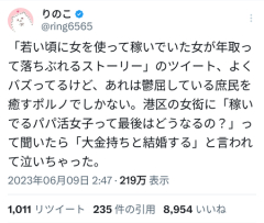 1: 2023/06/10(土) 21:00:00.67 ID:TLRkgRpO0 これマジ? とはいえ世の中美味しい話ばかりではありません。パパ活や夜職でこれらを失う人もいます。・マトモな金銭感覚・健康な身体・健康なメンタル・昼職の友達・男性を好きになる気持ち・人そのものを信じる心・小さな幸せを感じられる感性▼前書いたコラム— りのこ (@ring6565) June 9, 2023 ※関連記事 【画像】中国のパパ活女子(15)、衝撃的すぎると話題に…