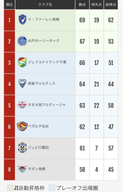 1: 名無し@サカサカ10 2025/11/23(日) 17:4311/23(日)J2第37節 水戸 vs 長崎(ホーム) 1ー2これによりJ1昇格チームは11/29(土)最終節に突入リーグ優勝は、長崎、水戸、千葉の3チーム2位以上に与えられるJ1自動昇格は、徳島を含めた4チーム3~6位が出場するJ1昇格プレーオフ出場は、磐田までの7チームでの争いに、、、…