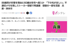 1 : 2 : 88歳男が好意を理由に60歳女性宅へ侵入か 「下の毛がほしい」不適切メモを残しストーカー容疑で再逮捕 容疑の一部を否認 兵庫・洲本市 88歳の男が60歳女性に対して、住居侵入やストーカー行為をした疑いで、きょう=22日、警察に逮捕されました。 ストーカー規制法違反などの疑いで逮捕されたのは洲本市五色町上堺の88歳の男です。 男はきのう=21日、洲本市内の60歳女性の自宅に侵入し、メモ紙の入った袋を置くなどした疑いが持たれています。 5 : その辺落ちてんだろ 6 : これもう現代の妖怪じゃん…