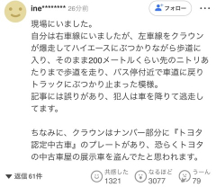 1: 名無しさん@ 2025/11/24(月) 14:31:36.82 ID:ZeaunUcS9 【速報】警視庁が運転手とみられる人物確保 2025年11月24日 14時23分 共同通信 905: 名無しさん@ 2025/11/24(月) 15:35:36.66 ID:nyjxG6yw0 >>1 都内でひき逃げなんかしたら あり得ない早さで捕まるよ 6: 名無しさん@ 2025/11/24(月) 14:32:43.52 ID:Sw2tCJ6Z0 逃げ切れないだろ 14: 名無しさん@ 2025/11/24(月) 14:34:23.82 ID:/TVmMXR70 誰? 16: 名無しさん@ 2025/11/24(月) 14:35:01.07 ID:5LxvCs+k0 早いね さすがニッポン 58: 名無しさん@ 2025/11/24(月) 14:39:41.21 ID:EsEhUaQm0 試乗車でもないのに鍵はどうしたんだ? 85: 名無しさん@ 2025/11/24(月) 14:43:16.61 ID:BRAgz4rV0 確保できたのか、良かった 92: 名無しさん@ 2025/11/24(月) 14:43:53.65 ID:kzJkS1Xk0 これは殺意300% 118: 名無しさん@ 2025/11/24(月) 14:45:52.88 ID:wr7uhXR+0 【東京足立】盗難車で歩行者11人を轢いて、2人が心肺停止、運転手は逃走中 222: 名無しさん@ 2025/11/24(月) 14:54:09.75 ID:Glv6cRd70 さらに足立区の火災で死者 387: 名無しさん@ 2025/11/24(月) 15:08:23.53 ID:0vBL9x8L0 東京消防庁や警視庁によると、13人が負傷し、複数人が搬送された。このうち、20代とみられる女性と80代とみられる男性の2人が心肺停止との情報がある。 心肺停止きたね 531: 名無しさん@ 2025/11/24(月) 15:18:03.40 ID:4G5Y86a10 一個前ぐらいのクラウンだから 自動ブレーキついてるだろ 651: 名無しさん@ 2025/11/24(月) 15:24:05.33 ID:zvRbZhNC0 【速報】心肺停止の2人は、20代女性と80代男性|47NEWS(よんななニュース) 2025年11月24日 15時18分共同通信 678: 名無しさん@ 2025/11/24(月) 15:25:04.00 ID:XRgMIQop0 歩道200メートルってかなり長い距離だぞ これは故意だろう 引用元…