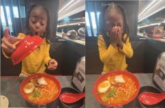 近年、SNSやインバウンドの影響で、国内のみならず、世界的な人気を誇っている日本の「ラーメン」。「ラーメン」の語源については諸説ありますが、中国西北部に位置する蘭州の麺の一種「拉麺」が由来という説や、1922年(大正11年)北海道札幌市に開店した「竹家」という食堂で、店主の妻が厨房の中国出身の料理人が大声で「好了(ハオラー=出来ました)」と告げるアクセントが気に入り、「ラーメン」としたなどの説がよく知られています。ただし、日本では戦前は「南京そば」など、戦後は「中華そば」と呼ばれることの方が多く、「ラーメン」という呼称が一般的になったのは、1958年 (昭和33年) に発売された初のインスタントラーメン、「チキンラーメン」が普及したためだと考えられています。昔は海外では「Chinese noodle」と呼ばれていましたが、現在は海外でもそのまま「ramen」で通じるまでに普及。各国にラーメン店も多く進出していますが、近年は日本同様に、回転寿司店のメニューにもなっています。今回ご紹介する動画では、海外のくら寿司の店舗で、少女がラーメンに大感激する様子が収められており、その興奮ぶりと喜びようが大反響を呼んでいます。撮影者であるママさんは動画の概要欄で、「子どもたちはラーメンが大好きですよね」と記載しているように、今ではラーメンは、海外の子供たちにとっても大好物になっているようです。各SNSに寄せられていた反応をまとめましたので、ご覧ください。「完全に日本人だw」 日本での生活に馴染み過ぎな海外幼児に世界がほっこり…