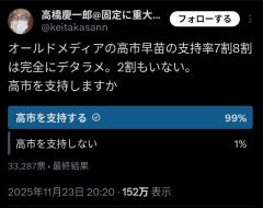 【悲報】パヨクさん、高市内閣支持率は高すぎてデタラメだとアンケート実施→支持率99%