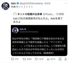 1: 2025/11/26(水) 12:48:43.386 やめてー!!!!! — Ado (@ado1024imokenp) November 26, 2025 ※関連記事 【悲報】Adoが5秒で消した投稿がこちらwwwwwwwww…