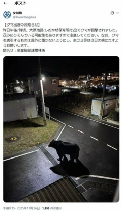 1: 名無しさん 2025/11/26(水) 16:50:12.49 ID:b1Rgobxs9 宮城県女川町は26日、前日夜に町内でクマが目撃されたとして公式X(旧Twitter)で注意喚起した投稿について、掲載したクマ画像が「生成AIによるフェイク画像」だったと発表した。さらに、クマの目撃情報自体も事実ではなかったという。 女川町は26日、公式Xで「25日午後7時ごろ、大原地区(しおかぜ保育所付近)でクマが目撃された」と投稿。 「茂みにひそんでいる可能性もある」と注意を呼びかけ、目撃者から提供されたとしてクマの画像を掲載した。 その後、画像の作成者から町に対し「生成AIで作成したフェイク画像だった」と申し出があり、町が確認したところ、目撃情報も虚偽だったことが判明したという。 当該投稿は26日午後4時時点で300万回以上表示されており、町は情報の精査を徹底するとしている。…