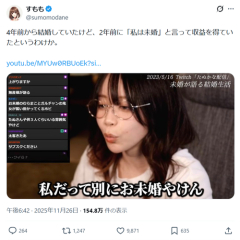 1: 2025/11/26(水) 22:34:47.02 4年前から結婚していたけど、2年前に「私は未婚」と言って収益を得ていたというわけか。 pic.twitter.com/mKmatJke2B— すもも (@sumomodane) November 26, 2025 ※関連記事 【速報】たぬかな、4年前から結婚していた。誕生日に貢がせた直後に発表。ガチ恋ホビット発狂へ…