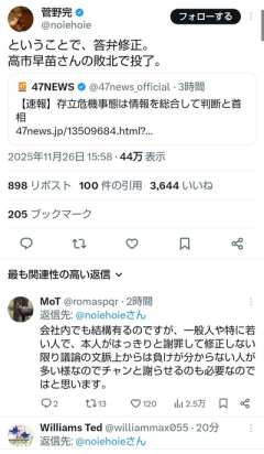 1 名前:名無しさん@涙目です。[] 投稿日:2025/11/26(水) 18:59:04.91 ID:VbP0cVvs0 11月7日の岡田議員に対する答弁 【詳報】台湾有事と存立危機事態を巡るやりとり(2025年11月7日) 高市首相 (略)いかなる事態が存立危機事態に該当するかは実際に発生した事態の個別具体的な状況に即して、すべての情報を総合して判断しなければならない。 ↓ 今日 存立危機事態は情報を総合して判断と首相 2025年11月26日 15:23 高市首相は党首討論で、存立危機事態の認定について「実際に発生した事態の個別具体的な状況に即して、全ての情報を総合して判断する」と述べた。 2 名前:名無しさん@涙目です。[] 投稿日:2025/11/26(水) 18:59:11.74 ID:VbP0cVvs0 今日の答弁に対するパヨク界隈の反応一部抜粋 163 名前:名無しさん@涙目です。[sage] 投稿日:2025/11/26(水) 19:46:15.22 ID:E0nQ7nxm0 >>2 これが17%の面々の知能w 192 名前:名無しさん@涙目です。[] 投稿日:2025/11/26(水) 20:03:12.76 ID:Hhl3q1ey0 >>2 何ひとつ何も変わってないというのに、こいつらの変わりようは何なんだ 頭存立危機事態か 13 名前:名無しさん@涙目です。[] 投稿日:2025/11/26(水) 19:03:09.87 ID:BxEV9vQW0 >>2 こんなんで立憲民主党から1億円を貰えるとか楽勝商売で羨ましい 50 名前:名無しさん@涙目です。[sage] 投稿日:2025/11/26(水) 19:15:05.69 ID:azgG5Pi90 同じこと言ってるよね普通に…… 3 名前:名無しさん@涙目です。[] 投稿日:2025/11/26(水) 18:59:35.73 ID:dvSHX6rX0 日本語できないんでしょ 17 名前:名無しさん@涙目です。[sage] 投稿日:2025/11/26(水) 19:04:01.53 ID:faF4leQU0 ぱよくに日本語はちょーっと難しかったかなー 15 名前:名無しさん@涙目です。[] 投稿日:2025/11/26(水) 19:03:46.61 ID:us/S7cJv0 高市のトーンダウンwww 20 名前:名無しさん@涙目です。[] 投稿日:2025/11/26(水) 19:05:32.24 ID:Fx/w7pof0 >>15 一貫して同じこと言うのをトーンダウンと言うのか 48 名前:名無しさん@涙目です。[] 投稿日:2025/11/26(水) 19:14:49.76 ID:zPIeFEDz0 パヨクと五毛の精神的勝利マジでヤバイな 脳に欠陥があるとしか思えん 9 名前:名無しさん@涙目です。[] 投稿日:2025/11/26(水) 19:01:46.08 ID:Y80SvNG20 本気で知能に障害あると思う 18 名前:名無しさん@涙目です。[] 投稿日:2025/11/26(水) 19:04:49.95 ID:InXa581V0 そういう精神勝利でもしなけりゃやってられんのだろう 恥ずかしい奴ら 39 名前:名無しさん@涙目です。[] 投稿日:2025/11/26(水) 19:11:43.95 ID:MvJfVfPv0 「まともに答えた高市が悪い!普通は曖昧にして誤魔化す答弁をするのが総理大臣だろ!」っていうアホいるけどさ、 そもそも何で立憲の岡田はそんな危険な質問をしたのかって話だもんな そんなに中国を敵に回したくないならそんな危険な質問しなきゃいいだけの話 何の意図があってこんな具体的な国名出しての質問したんだ?なあ? そういう予定調和の茶番を国会でやる意味は何だよ?なあ?アホか 197 名前:名無しさん@涙目です。[sage] 投稿日:2025/11/26(水) 20:04:47.62 ID:y6p2ypfV0 >>39 曖昧な答えを引き出すことだけが目的の質問ってただの時間の無駄だよな 政府の見解が変わってないかの確認するくらいならともかく執拗に問い詰める意味がまるでない 43 名前:名無しさん@涙目です。[] 投稿日:2025/11/26(水) 19:12:28.36 ID:MvJfVfPv0 中国に「その汚い首を切ってやる!」と言われてもポケットに手を突っ込まれても日本のメディアどもは今日もヘラヘラ中国擁護(笑) 78 名前:名無しさん@涙目です。[] 投稿日:2025/11/26(水) 19:22:05.91 ID:Ze0p+cDZ0 >>43 だよな。 それが仮に自民の誰かだったら、鬼の首を取ったように顔を真っ赤にしてギャーギャー喚き散らかすのにな。 72 名前:名無しさん@涙目です。[sage] 投稿日:2025/11/26(水) 19:20:58.88 ID:hE/YxocQ0 なんでこいつらは一斉に同じこと言い出すの? 54 名前:名無しさん@涙目です。[] 投稿日:2025/11/26(水) 19:16:12.76 ID:MvJfVfPv0 日本のテレビ局ってほんとどこの局も「高市が悪い!」と中国の言い分を放送するだけだもんな(笑) 一体どこのテレビ局だよこいつら 年中、韓国ゴリ押しはするしさあ 40 名前:名無しさん@涙目です。[] 投稿日:2025/11/26(水) 19:11:47.46 ID:uvM2zsOn0 オールドメディアが必死こいて高市が修正したって報道してんの中共指示なん? 28 名前:名無しさん@涙目です。[sage] 投稿日:2025/11/26(水) 19:08:37.72 ID:Jzs2ULYp0 もうやめたいんだろ 中共が 87 名前:名無しさん@涙目です。[] 投稿日:2025/11/26(水) 19:24:33.31 ID:+OyzqziA0 >>28 振り上げた拳の置き場探し始めとるね 高市早苗が折れないから 馬鹿馬鹿しい (´・_・`) 68 名前:名無しさん@涙目です。[] 投稿日:2025/11/26(水) 19:19:33.07 ID:sjP3B0Sj0 全力で誤魔化しに来てるよなあ 239 名前:名無しさん@涙目です。[sage] 投稿日:2025/11/26(水) 20:59:58.58 ID:dXzp0o4t0 パヨの親分は気付いてるぞw 271 名前:名無しさん@涙目です。[sage] 投稿日:2025/11/26(水) 21:38:39.90 ID:bJwgEvkT0 >>239 さすがCさんw 251 名前:名無しさん@涙目です。[sage] 投稿日:2025/11/26(水) 21:07:07.98 ID:O1yBn7KR0 >>239 さすが直属って感じで草 254 名前:名無しさん@涙目です。[] 投稿日:2025/11/26(水) 21:08:45.44 ID:1KzwiMxc0 >>239 余計な事言うんじゃねーよって思ってそう 菅野完とかな 266 名前:名無しさん@涙目です。[sage