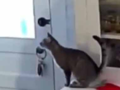 猫カフェで掃除をしていた。窓ガラスにスプレーしてフキフキ♪ → 猫、手伝います…