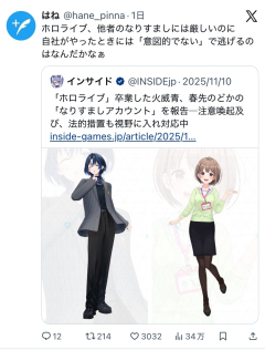 引用元: 14: Vtuberまとめ2025/11/27(木) 18:10:55.02 うおw 22: Vtuberまとめ2025/11/27(木) 18:11:20.77 >>14 草 27: Vtuberまとめ2025/11/27(木) 18:11:31.22 >>14 ひん 30: Vtuberまとめ2025/11/27(木) 18:11:47.60 >>14 もっと言ったれ 31: Vtuberまとめ2025/11/27(木) 18:11:48.21 >>14 ひん 34: Vtuberまとめ2025/11/27(木) 18:11:51.85 >>14 カバー言われてんぞw 37: Vtuberまとめ2025/11/27(木) 18:11:58.65 >>14 くぉんの… 78: Vtuberまとめ2025/11/27(木) 18:13:58.48 >>14 でもこれはカバーちょっと見直したけどな やめたやつのケアもちゃんとしてるんやって 89: Vtuberまとめ2025/11/27(木) 18:14:25.28 >>14 何に憤ってるのかしらんが、常識的に考えてそりゃそうだろ 96: Vtuberまとめ2025/11/27(木) 18:14:45.69 >>14 何も言い返せんかったわ… 106: Vtuberまとめ2025/11/27(木) 18:15:12.94 >>14 間違ってないな 212: Vtuberまとめ2025/11/27(木) 18:19:12.79 >>14 おいみこち! どういうことだよこれ!…