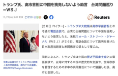 1 : トランプ氏、高市首相に中国を挑発しないよう助言 台湾問題巡り=WSJ(ロイター) - Yahoo!ニュース トランプ米大統領は高市早苗首相との今週の電話会談で、台湾の主権問題について中国を挑発しないよう助言したと、米紙ウォール・ストリート・ジャーナル(WSJ)が26日、電話会談について説明を受けた日本政府当局者と米関係者の話として報じた。全文はソースで 15 : アメリカ依存も徐々に薄めて行こう!…