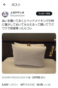 1: 名無しのアニゲーさん 2025/11/28(金) 07:29:35.770 ID:YRHiuYQtU ぬい活界隈は前からわざとホテルにぬいぐるみを忘れてホテルの従業員の対応をチェックする行為が横行してたがここにきて炎上した…