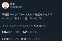 1:映画.netがお送りします 2025/11/27(木) 19:43:04.88 ID:6I8Tna6q0.net 27:映画.netがお送りします 2025/11/27(木) 20:31:54.64 ID:444+/F960.net >>1 集中力なさそう 3:映画.netがお送りします 2025/11/27(木) 19:45:27.17 ID:SjZYpw8H0.net ポップコーンぶち撒けるマイクラ映画見に行ったら発狂しそう スレッドURL: 4:映画.netがお送りします 2025/11/27(木) 19:51:58.97 ID:5MMEuZiG0.net ポストしてる奴もリポストしてる奴も 映画に集中してなくて草 5:映画.netがお送りします 2025/11/27(木) 19:52:13.08 ID:RIWf6EZ90.net スカスカスカーレットは気兼ねなく食べられそう 6:映画.netがお送りします 2025/11/27(木) 19:53:52.03 ID:Bxfgw9cf0.net だそうですよ?映画館さん アナタたちの大事な副収入が叩かれてますよ。 僕もポップコーンなんて食いたくないけど、アナタたちがコレだけ食えって言いますしね。 他の飲食物持っていくと、入場拒否されるし。 8:映画.netがお送りします 2025/11/27(木) 19:56:38.36 ID:Bxfgw9cf0.net まあ、他のスナック菓子よりは音がしないんだけどね 確かにポテトチップや煎餅なんか食われるよりははるかに音がしない 9:映画.netがお送りします 2025/11/27(木) 19:57:21.16 ID:rcSRtD/E0.net マシュマロでも売るか 10:映画.netがお送りします 2025/11/27(木) 19:58:00.51 ID:6ZTZBE8m0.net 俺凄い事思いついちゃったんだけど 映画館ではVRゴーグルとヘッドフォンを必須にして上映すれば 広い場所と椅子だけあればよくてスクリーンが必要なくなるんぢゃね? 食べてる音も気にならなくなるし他人が何してるかも見えなくて済みそう 11:映画.netがお送りします 2025/11/27(木) 19:59:25.71 ID:/vmEQr9G0.net >>10 それを推し進めるとネットカフェが映画を最大限楽しめる施設にならんか? 12:映画.netがお送りします 2025/11/27(木) 20:06:33.40 ID:txOyt5Hz0.net 一人で とは書いてなくね? 13:映画.netがお送りします 2025/11/27(木) 20:08:46.64 ID:tJJMd7xk0.net 尿意を防ぐために映画館は大福を売るべき 14:映画.netがお送りします 2025/11/27(木) 20:13:52.58 ID:AEkPpogi0.net 実際、映画館にポップコーンは向いてないと思う こぼれやすいし、割と音も出る 15:映画.netがお送りします 2025/11/27(木) 20:14:11.48 ID:AEkPpogi0.net 沖縄名物の「てんしのはね」とか売ってくれたらいいのに 16:映画.netがお送りします 2025/11/27(木) 20:14:41.15 ID:eFHOnaJi0.net 今ってマクドやケンタッキー食ったらケチつけられるんだろ? ならポップコーンしか食うもんねーじゃん それにまでケチつけるんか? 18:映画.netがお送りします 2025/11/27(木) 20:20:03.71 ID:xEk97Rwh0.net ながら食いは太るで 22:映画.netがお送りします 2025/11/27(木) 20:28:57.00 ID:yAfcVzfK0.net まず大原則として館内で買って普通に食べてる人を非難するのはダメだわな スレタイの「ポップコーン食べるバカ」という主張は 館に対する営業妨害みたいなもん 23:映画.netがお送りします 2025/11/27(木) 20:29:23.87 ID:pbE+65sD0.net そういうのも含めて行くもんだと思うんだが違うのか 俺ルールで見せろってやつは違う方法で視聴すればいいだけ 24:映画.netがお送りします 2025/11/27(木) 20:29:45.74 ID:lsS9lgqb0.net 音が全く出ない食い物ってなんだろうな。 ゼリーやだんごとか? 全く映画館に来てる粋な感じがしないが。 36:映画.netがお送りします 2025/11/27(木) 20:55:47.22 ID:AEkPpogi0.net >>24 >>15 26:映画.netがお送りします 2025/11/27(木) 20:31:21.34 ID:xjtNDQXe0.net 飲食禁止でチケット倍の映画館でもやってみたら いいんじゃないかな 倍で済むのかは知らない 28:映画.netがお送りします 2025/11/27(木) 20:32:12.50 ID:SA9ikUaV0.net >>26 映画代とは別に座席チャージ代3000円とかねw 29:映画.netがお送りします 2025/11/27(木) 20:33:15.23 ID:kRH1jxqsH.net 家でホームシアターでも作ってろ 30:映画.netがお送りします 2025/11/27(木) 20:33:30.58 ID:HsgHP8Or0.net 映画館にどっちが正しいか聞いて 自分になると思ってんのか? 31:映画.netがお送りします 2025/11/27(木) 20:34:44.69 ID:52q2LL4o0.net アホなこと言ってるとトルティーヤになるぞ 32:映画.netがお送りします 2025/11/27(木) 20:36:55.78 ID:QJiq6qdk0.net 映画館どんどん値上げしてるからな 2000払って2時間楽しむぞーと思ったら隣でデブがくちゃくちゃ食ってたらイライラするわな 34:映画.netがお送りします 2025/11/27(木) 20:42:20.06 ID:S+zabkdQ0.net ポップコーンは音が小さいから採用されたんだぞ ポテチとか煎餅と比べ物にならんくらい音小さいのに 35:映画.netがお送りします 2025/11/27(木) 20:42:39.46 ID:lVjQs67X0.net 映画館でチョコ食べるなチョコくせーんだよ 37:映画.netがお送りします 2025/11/27(木) 20:56:20.99 ID:fkTu/veq0.net 冒頭で喋るなだの音たてる系のこと言ってるけどポップコーンがイッチバンうるせーんだよ 意味もなくかき混ぜて食う馬鹿とかいるしな どうせ食うんだからどれも同じだよバーカ 38:映画.netがお送りします 2025/11/27(木) 20:59:53.31 ID:/OVeQbdw0.net アホみたいにガサゴソしてるポップコーンキチガイが隣にいると スタッフロール終わって明るくなった時に高確率で俺のズボンや足元にポップコーン落ちまくってる ほんとキモい 39:映画.netがお送りします 2025/11/27(木) 21:02:35.57 ID:VDyCaC/I0.net ジュースの氷ガラガラ振り続ける奴とかもい