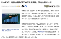 1 : U-NEXT、有料会員数が500万人を突破。国内企業では初(PHILE WEB) - Yahoo!ニュース U-NEXTは、同社サービスの有料会員数が、2025年11月時点で500万人を突破したと発表した。同社によれば、月額550円(税込)を超えるプレミアム有料型の放送・配信サービスとして国内企業では初とのこと。 U-NEXTは2007年に「GyaO NEXT」としてサービスを開始し、2009年に現名称に変更。2023年5月に有料会員300万人、同年9月に400万人を突破した。加えて同年7月、TBS/テレビ東京/WOWOWの合同動画配信サービスであった「Paravi」を統合したことも成長の加速につながり、この度500万人という節目を迎えたとしている。全文はソースで 2 : 高いけどやっぱU-NEXTがええと思うわ…