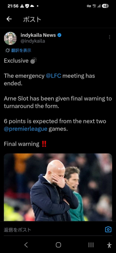【速報】リヴァプール緊急会議の結果、スロット監督…この2試合に勝てば延命キターwwwwwww