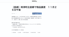 1 : 長崎県警によると、26日午後3時10分ごろ、時津町左底郷の路上で男子児童への物品譲渡が発生しました。(実行者の特徴:年配男性、小柄、黒色ジャンパー、黒色キャップ帽、前カゴ付き自転車) ■実行者の言動や状況 ・自転車に乗り、下校途中の男児に声をかけ、トイレットペーパーの芯で作った人形のような物を渡した。 ・「これあげる、自分で作ったんだ」 (長崎)時津町左底郷で物品譲渡 11月26日午後 | NEWSjp 6 : なにそれ怖い 7 : 別に犯罪じゃねーだろ 14 : >>7 犯罪とは誰も言ってません…