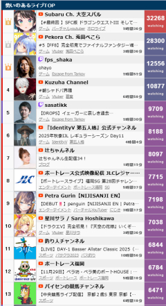 引用元: 753: Vtuberまとめ2025/11/29(土) 15:40:32.38 あっこりゃあああ 764: Vtuberまとめ2025/11/29(土) 15:41:00.69 >>753 相変わらず昼スバルは最強やな 770: Vtuberまとめ2025/11/29(土) 15:41:19.40 >>753 ぺこら3万行かなくなったか 773: Vtuberまとめ2025/11/29(土) 15:41:23.09 >>753 タコセンかと思ったわ 778: Vtuberまとめ2025/11/29(土) 15:41:32.50 >>753 こより終わってて草 790: Vtuberまとめ2025/11/29(土) 15:42:01.11 >>753 葛葉も釈迦も弱いな 794: Vtuberまとめ2025/11/29(土) 15:42:10.77 >>753 シンプルに配信少なすぎやしね~か? 休日の昼だぞ 797: Vtuberまとめ2025/11/29(土) 15:42:24.81 >>753 昼RPGサボってスバルに客奪われたからしゃーなし 802: Vtuberまとめ2025/11/29(土) 15:42:32.63 >>753 これ見てたら一般化なんてしなくていいと思うわ 一般化して絡ませる対象がストリーマーなんだろ? 数字出てないじゃん 811: Vtuberまとめ2025/11/29(土) 15:42:59.82 >>753 こよりいなくて草 817: Vtuberまとめ2025/11/29(土) 15:43:06.15 >>778 案件あるからな 833: Vtuberまとめ2025/11/29(土) 15:43:57.68 >>753 辻ちゃん配信やってんだ しかも強いし 834: Vtuberまとめ2025/11/29(土) 15:44:01.43 >>753 休日なんだからもっとやれよと思うわ…
