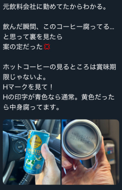 278 名前:既にその名前は使われています[] 投稿日:2025/10/15(水) 22:53:57.03 ID:l7X7LXG7 284 名前:既にその名前は使われています[] 投稿日:2025/10/16(木) 01:05:30.70 ID:Hav8ezAW >>278 このマークあるのはコカコーラ製品のコーヒーだけな、元コーラベンダーより。 あと腐ってるんじゃなく加温し過ぎて味が劣化してる状態、自販機の温度設定次第で変質する期間が変わる。 300 名前:既にその名前は使われています[] 投稿日:2025/10/16(木) 07:56:27.68 ID:VjQIiR0n >>278 >>284 Hマークがどれを指してるのかわからない +HS/って書いてる、Hの文字のこと? 301 名前:既にその名前は使われています[] 投稿日:2025/10/16(木) 07:57:43.95 ID:cmwJkMJB 年の下あたりにうっすらと見えるだろ 335 名前:既にその名前は使われています[] 投稿日:2025/10/16(木) 16:07:40.87 ID:28tgN6GI >>300 日付の下にある#と思われる 286 名前:既にその名前は使われています[] 投稿日:2025/10/16(木) 01:25:01.29 ID:lweJWUwY 腐ってたら缶膨張して開けた時に吹くだろっていう そもそも缶詰なんて缶が腐食でもしない限り消費期限ないだろ? 287 名前:既にその名前は使われています[] 投稿日:2025/10/16(木) 01:32:52.57 ID:Tf21F410 缶詰めは理論上はいけるけど保証は一切しないというスタンスで 賞味期限=消費期限扱いやなかったかな 288 名前:既にその名前は使われています[] 投稿日:2025/10/16(木) 01:54:13.96 ID:R0Nqjb03 缶密閉されてるのに半年で腐らせるほうが難しいだろ 289 名前:既にその名前は使われています[] 投稿日:2025/10/16(木) 01:59:01.85 ID:wjNW8DHL ホット対応のミルク入りコーヒー飲料は温めても冷やしても三か月くらいで劣化するんだよ 特にホットに入れて長時間経過したものは開けた瞬間吐き気するくらいに劣化する 290 名前:既にその名前は使われています[] 投稿日:2025/10/16(木) 02:09:56.16 ID:huWVZ5V3 >>289 それは腐敗している、腐っているということ? 292 名前:既にその名前は使われています[] 投稿日:2025/10/16(木) 02:19:52.11 ID:wjNW8DHL >>290 ダイドーで論文だしてたりするけど腐敗とは言わず劣化と表現してたな ベンダーの入れ替えしてる人はHOT販売の場合はちゃんとツールで管理してて数週間したら全部抜いて入れ替えてる 個人で入れ替え管理してるとこがヤバイ 295 名前:既にその名前は使われています[] 投稿日:2025/10/16(木) 03:26:02.89 ID:GsWmnO++ ホット缶コーヒーのPDFであったのはキリンの論文だったな ググったら乳脂肪が加熱劣化で酸化分離するので2週間を目処に消費すること 半年経ったホット缶ミルクコーヒー(だった物)を飲んだら腹壊した話もあった 293 名前:既にその名前は使われています[] 投稿日:2025/10/16(木) 02:24:41.47 ID:jEo0MGDb ミルク入ってると分離して凝固するんじゃね? 腐ってるとはまた別の状態 ワイはカルピスがそうなった 未開封だから別に腐ってないんだが沈殿物が固まってて振っても戻らんかったw 缶コーヒーの女神(1) (ヒーローズコミックス)posted with AmaQuick at 2025.11.27根岸岳春(著)ヒーローズ (2022-06-03T00:00:00.000Z)¥713Amazon.co.jpで詳細を見る 旅する缶コーヒーposted with AmaQuick at 2025.11.27マキヒロチ(著)実業之日本社 (2013-11-23T00:00:00.000Z)¥594Amazon.co.jpで詳細を見る…