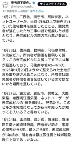 1: フォーク攻撃(東京都) [EU] 2025/11/29(土) 08:52:29.59 ID:ofCn40ZH0● BE:662593167-2BP(2000) sssp://img.5ch.net/ico/taxi.gif 2: フォーク攻撃(東京都) [EU] 2025/11/29(土) 08:52:42.02 ID:ofCn40ZH0 BE:662593167-2BP(1000) sssp://img.5ch.net/ico/taxi.gif 引用元: ・ スポンサーリンク スポンサーリンク 10: 河津落とし(ジパング) [US] 2025/11/29(土) 08:58:30.79 ID:vOLoLeny0 >>1 これがみんな完成したらどんだけの経済効果を産むかも想像できない馬鹿なん? 15: ネックハンギングツリー(日本のどこかに) [EU] 2025/11/29(土) 09:00:54.07 ID:wUy500IK0 >>10 壊してまた建てて金集めたほうが効率的だろ 25: 名無しさん@涙目です。(大阪府) [US] 2025/11/29(土) 09:03:55.93 ID:AA2XYP3f0 >>10 完成しても産まないから完成しないんだぞ 32: デンジャラスバックドロップ(北海道) [CA] 2025/11/29(土) 09:05:54.13 ID:lZvEs0cw0 >>10 完成させる金がないから未完成なんだぞ 永遠に完成しないものはゴミにしかならない 33: エクスプロイダー(北海道) [US] 2025/11/29(土) 09:06:36.98 ID:pWkdlpB00 >>10 じゃあなんで未完成で放置されてるんですかね……? 51: バズソーキック(茸) [US] 2025/11/29(土) 09:18:50.33 ID:CJQmw8iF0 >>10 人口の3倍以上のマンション作ろうとしてて誰が買うの?住むの?利用するの?www 58: 名無しさん@涙目です。(東京都) [IT] 2025/11/29(土) 09:22:30.86 ID:/ZmwRcQd0 >>10 完成しなかった場合は経済はどうなるの? 97: ファイヤーボールスプラッシュ(庭) [US] 2025/11/29(土) 09:51:12.24 ID:nqi8YSux0 >>10 誰も買わないからマイナスの経済効果しかないだろうね 69: 腕ひしぎ十字固め(愛知県) [CN] 2025/11/29(土) 09:31:21.59 ID:GMGzvZCf0 >>61 海南島の広大リゾート跡地か 恐ろしいんが海南島は日本の呉みたいな海軍の拠点で人民解放軍の軍人は日常的にこの風景見てる事 ディストピアみたいな風景が日常の軍人てパラダイス求めてヤケになってそう 73: オリンピック予選スラム(東京都) [BR] 2025/11/29(土) 09:32:50.36 ID:7+vuIHdR0 >>61 東京の不揃いなビル群も違和感あるけど統一するともっと気持ち悪いのね 94: オリンピック予選スラム(長野県) [US] 2025/11/29(土) 09:50:09.80 ID:Cw1aBCjz0 >>1 5年遅れのスレ立て、乙です 3: ジャンピングDDT(やわらか銀行) [ニダ] 2025/11/29(土) 08:53:20.77 ID:erbc6RAl0 サバゲーに使わせたらいい 86: トペ コンヒーロ(やわらか銀行) [US] 2025/11/29(土) 09:44:22.60 ID:5D2+bfLf0 >>3 駆け回ったら倒壊しちゃうよwww 4: 稲妻レッグラリアット(栃木県) [DE] 2025/11/29(土) 08:53:57.00 ID:GqNBPhDM0 日本にはメガソーラーが大量増殖 5: バズソーキック(SB-Android) [US] 2025/11/29(土) 08:54:44.65 ID:MvxBCbdo0 この話は シナもう数年前だよな バブル崩壊だから 6: ドラゴンスクリュー(東京都) [ニダ] 2025/11/29(土) 08:55:13.12 ID:Ax2VJGVF0 恒大集団の余波か? 8: マスク剥ぎ(やわらか銀行) [US] 2025/11/29(土) 08:57:13.08 ID:l1mdwG8t0 土地も人も資材もあり余ってっからな。 12: ブラディサンデー(庭) [BR] 2025/11/29(土) 08:59:56.54 ID:F10Y2yjK0 数年前から聞いた話だな 鉄筋コンクリートのみで放置されてる所に住んでる中国人も居た気がする 16: ランサルセ(埼玉県) [JP] 2025/11/29(土) 09:01:04.25 ID:D17teKoJ0 >>12 金払っちゃってるし売れないからね、仕方ないね。 14: 河津掛け(庭) [US] 2025/11/29(土) 09:00:47.40 ID:m9N2CcG/0 バブル崩壊したん? 24: タイガードライバー(静岡県) [DE] 2025/11/29(土) 09:03:26.49 ID:GE/mZWx40 >>14 とっくにね 中共は否定してるが 若者の失業率を見れば一目瞭然 いい大学を出ても就職先が無いのだよ 17: ニーリフト(茸) [JP] 2025/11/29(土) 09:01:05.24 ID:2qsvVcC30 中国国内でもチャイナリスク 19: グロリア(神奈川県) [NZ] 2025/11/29(土) 09:01:47.98 ID:ZZORYqCx0 将来が楽しみだね(白目) 20: サッカーボールキック(埼玉県) [FR] 2025/11/29(土) 09:01:51.43 ID:F8Z4YHQP0 未完成ビルが宇多田ヒカルに見えてドキっとした 21: タイガードライバー(静岡県) [DE] 2025/11/29(土) 09:02:01.60 ID:GE/mZWx40 問題はその建設に関する債務が膨れ上がってること。正確な統計が出せない国だから天文学的な金額になっていても表沙汰にならないだけ。実質既に崩壊しているとみるのが妥当。高市発言にあそこまでピリピリしてるのがその証拠だ。 22: アトミックドロップ(埼玉県) [US] 2025/11/29(土) 09:02:06.08 ID:LM/cGDwe0 戦争で破壊され解体費を浮かし戦後賠償で2度ウマーを狙ってる 絶対に負けられないぞ 23: スパイダージャーマン(SB-Android) [CN] 2025/11/29(土) 09:02:40.01 ID:do+p8Qud0 中国さん、風で建物が崩壊してしまうw 11月24日、北京市西城区前二胡同に10年以上立っていた門が突如強風で倒壊し、ネットユーザーらは家が全壊したと伝えた。 27: ニールキック(神奈川県) [US] 2025/11/29(土) 09:04:46.79 ID:sJBrTjJy0 前までは中国のビル群は凄いんだぞ!っていろんなスレに画像付きコピペを貼りまくってたヤツいたけど最近全く見なくなったな 28: ジャンピングDDT(やわらか銀行) [US] 2025/11/29(土) 09:05:04.76 ID:jPd62Vq/0 ホラー映画撮影し放題だな(´-ω-)ウム 29: 腕ひしぎ十字固め(愛知県) [CN] 2025/11/29(土) 09:05:07.95 ID:GMGzvZCf0 1つ目の動画の建物ってどういう構造になってんの? 地上階の上がスラブ床として、その上のスラブ床に挟まった薄いのなんなの? 30: スパイダージャーマン(東京都) [RO] 2025
