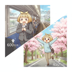 年収600万(電車乗換有り通勤90分) vs 年収450万(通勤徒歩5分)