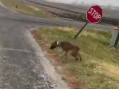 イヌたちと田舎の道を競争する。私は4輪バギーに乗ってアクセル全開!→ 1匹はこうなります…