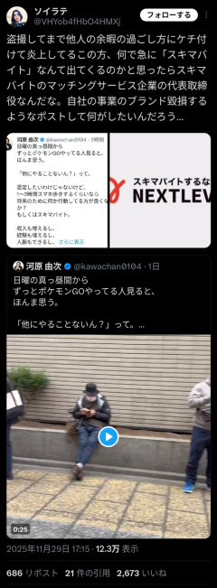 1: 2025/11/30(日) 16:15:20.71 盗撮してまで他人の余暇の過ごし方にケチ付けて炎上してるこの方、何で急に「スキマバイト」なんて出てくるのかと思ったらスキマバイトのマッチングサービス企業の代表取締役なんだな。自社の事業のブランド毀損するようなポストして何がしたいんだろう… pic.twitter.com/52dDZCaZVM— ソイラテ (@VHYob4fHbO4HMXj) November 29, 2025 わざわざ近寄ってスマホ画面まで盗撮 顔もはっきり盗撮 ちなみにツイ消し逃亡中 ※関連記事 【画像】この漫画の「ダメ人間」と付き合っている彼女の話、少し怖くて草wwwww…