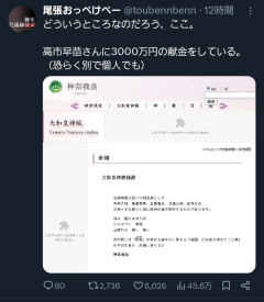 【狂気】高市早苗さんに3000万円寄付した団体がお前らの想像の1.7倍ぐらいヤバい