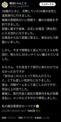 1: 2025/11/30(日) 17:55:43.18 38歳のときに、交際していた34歳の女性と温泉旅行に行きました。箱根の雰囲気のいい旅館で、離れの個室を予約できました。部屋に着き夕食後、お互いお風呂(男女別)に入る流れになりました。お風呂から出て部屋に戻ると、彼女はもう部屋にいました。…— 婚活にゃんこ (@zhai_yang33513) November 29, 2025 ※関連記事 【画像】この漫画の「ダメ人間」と付き合っている彼女の話、少し怖くて草wwwww…