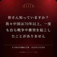 1: 名無し 2025/11/30(日) 16:55:12.09 ID:LiaR8China0 中国の呉江浩駐日大使が28日午後、自身のX(旧ツイッター)を更新。 呉氏は日本語で「永遠に覇権を追求せず、永遠に拡張せず、永遠に勢力圏を求めない---これが新時代中国の国防の鮮明な特だ」と書き出した。 そして「新中国成立から70年以上、中国は一度も自ら戦争や衝突を起こしたことがない。改革開放以来、中国は世界平和の促進に努め、軍隊の人員を自主的に400万人余り削減してきた」と主張。 この投稿に対し「残念ながら歴史記録と合いません」「都合のいい記憶力だ」「嘘を言ってはいけない」「モンゴル、チベット、ウィグルは如何ですか???」などとツッコミや反論を含め、さまざまな声が寄せられている。 Yahoo!ニュース ■要約 ・中国の呉江浩駐日大使がXで「永遠に覇権・拡張・勢力圏を求めない」と宣言。 ・「70年以上、自ら戦争や衝突を起こしたことがない」と主張し、平和国家をアピール。 ・これに対し、チベット・ウイグル・南シナ海・尖閣等の実例を挙げる反論が殺到。 ・軍事費の増大や周辺国への威圧行動と矛盾する発言に、呆れる声が広がっている。 ■解説 「嘘も百回言えば真実になる」という彼らの流儀を地で行くような投稿だ。 チベットやウイグルでの弾圧、インドとの国境紛争、ベトナム戦争、そして現在進行系の南シナ海や尖閣諸島での現状変更の試みを「なかったこと」にして、「平和勢力」を自称するのは、国際社会に対する侮辱ですらある。 特に日本に対しては、連日尖閣周辺で領海侵入を繰り返しておきながら、「覇権を求めない」などとよく言えたものだ。 高市政権が防衛力強化を進めているのは、まさにこの「言葉と行動が全く一致しない隣国」の脅威があるからに他ならない。 大使レベルが公式にこのような歴史修正プロパガンダを発信すること自体、中国外交の質が劣化している証拠であり、日本側はいちいち反論するまでもなく、冷ややかな視線で事実(ファクト)を突きつけ続けるだけで十分だ。 彼らの言う「平和」とは、「中国に従順である状態」を指す造語なのだと理解しておけば、腹も立たないだろう。 【快挙】中国BYD、日本で爆売れ!日本新車市場シェア0.1%を突破! 日本進出の2023年から累計5,305台の快進撃、日本車メーカーが震撼へ! 【画像】 深夜の歌舞伎町で酔い潰れているギャル、おっさんに持ち帰られるww 【動画】 警察車両が踏切を急いで渡ろうとするが……