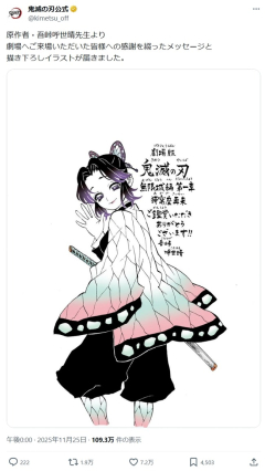 1: 風吹けば名無し 2025/11/25(火) 13:07:44.85 ID:u6w0LRTY0 原作者・吾峠呼世晴先生より劇場へご来場いただいた皆様への感謝を綴ったメッセージと描き下ろしイラストが届きました。 pic.twitter.com/C3TipEItoC— 鬼滅の刃公式 (@kimetsu_off) November 25, 2025 5: 風吹けば名無し 2025/11/25(火) 13:13:33.43 ID:1xe5oPu+d 顔知られてないから映画館行ったら隣に座ってる可能性もゼロではないんだよな…