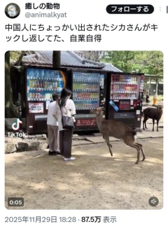 1: エッジワース・カイパーベルト天体(東京都) [DE] 2025/11/30(日) 20:18:16.24 ID:xR5bhEtP0● BE:662593167-2BP(2000) 引用元: ・ スポンサーリンク スポンサーリンク 52: カペラ(ジパング) [US] 2025/11/30(日) 23:36:52.91 ID:7vUbJIRT0 >>1 キングカス 2: エッジワース・カイパーベルト天体(東京都) [DE] 2025/11/30(日) 20:18:28.80 ID:xR5bhEtP0 BE:662593167-2BP(1000) sssp://img.5ch.net/ico/taxi.gif 3: セドナ(千葉県) [TR] 2025/11/30(日) 20:18:58.87 ID:H9WUwT5L0 これはシカたないな 4: かに星雲(新潟県) [ニダ] 2025/11/30(日) 20:19:20.52 ID:+Uxzw6gV0 鹿さん大丈夫かな 7: アークトゥルス(庭) [US] 2025/11/30(日) 20:20:05.88 ID:5y51bUDG0 先に手を出した方が悪い 11: ポラリス(みかか) [ヌコ] 2025/11/30(日) 20:23:26.59 ID:jB3TEkg90 >>7 足を出したのが悪いんだよ 9: カペラ(やわらか銀行) [JP] 2025/11/30(日) 20:21:55.20 ID:gXDsHE840 いたしかたない 10: アケルナル(庭) [US] 2025/11/30(日) 20:22:42.87 ID:Q7tnEjHb0 シカさんGJ 12: 宇宙の晴れ上がり(茸) [US] 2025/11/30(日) 20:23:42.42 ID:F6SwumM10 奈良の鹿はプライド高いな 侮辱されたらやり返す 14: 白色矮星(庭) [DE] 2025/11/30(日) 20:24:17.86 ID:5VxgziX30 なんで鹿を蹴飛ばそうとするんだ? やさしくなでるだけでいいのに 16: ジュノー(ジパング) [US] 2025/11/30(日) 20:25:11.67 ID:/BjRNsnU0 シカも自分の身は自分で守れるように 角を切らない方がええな 17: ネレイド(千葉県) [KR] 2025/11/30(日) 20:26:06.56 ID:N9TGO7Do0 へずまとその支持者の頭お花畑具合見るたびに嫌気が差す 19: ニート彗星(東京都) [ヌコ] 2025/11/30(日) 20:26:44.12 ID:CzCEPkf80 夏の動画が今頃 20: 亜鈴状星雲(ジパング) [DE] 2025/11/30(日) 20:27:15.53 ID:5+CE06Y40 人間を舐めてんのか 21: ポルックス(東京都) [ニダ] 2025/11/30(日) 20:29:09.91 ID:6oc0iM150 中国は これから第二次文化大革命に突入します 五毛の皆さん お達者で 22: 土星(みかか) [ニダ] 2025/11/30(日) 20:29:45.49 ID:aQjNs31u0 シナゴミw 頸動脈を食いちぎれば良かったのに 獣はいきなりスイッチが入る事があるんだから舐めたらだめなんだぞ 23: 環状星雲(神奈川県) [US] 2025/11/30(日) 20:31:11.74 ID:pO6d2YUN0 これは過剰防衛やろ 24: ソンブレロ銀河(やわらか銀行) [FR] 2025/11/30(日) 20:31:48.25 ID:3E53SzLk0 日本人も 負けちゃいらんねえな 25: レア(庭) [US] 2025/11/30(日) 20:33:16.43 ID:5XOi8vHd0 鹿によるヘイトある 主祭神たるタケミカヅチ、フツヌシ、アメノコヤネに謝罪を求めるあるよ 26: ベクルックス(鹿児島県) [US] 2025/11/30(日) 20:34:44.31 ID:zA1cD5O20 服装は薄着でかき氷がアル 27: 木星(茸) [ニダ] 2025/11/30(日) 20:36:37.81 ID:yzgqLwab0 鹿さん撫で撫でしてたらペロペロ仕返してくれたけど、舌がザラザラなんだなぁ。痛かったわw 28: キャッツアイ星雲(やわらか銀行) [US] 2025/11/30(日) 20:37:21.90 ID:3DviOZWX0 人間の方もしっかりしないとな 29: リゲル(やわらか銀行) [ニダ] 2025/11/30(日) 20:38:58.50 ID:lphBb9tM0 日本は危険だ 30: ミザール(千葉県) [CA] 2025/11/30(日) 20:42:43.37 ID:4eMbP9sJ0 鹿煎餅を貰えずイライラしている所に敵対的な挙動をしたから攻撃されたんだろう。 31: ベスタ(庭) [ニダ] 2025/11/30(日) 20:43:40.33 ID:WOYDKYID0 AIか? ここまで来るともう分からん こんなボタンだらけの自販機見たことないけどあるかもしれんし 33: ニクス(みかか) [US] 2025/11/30(日) 20:48:10.11 ID:XTNvZO180 野生動物ナメすぎだろ 36: 冥王星(茸) [IN] 2025/11/30(日) 21:09:03.73 ID:lWpnvJ4p0 へづま高市勝利じゃん 38: ニート彗星(ジパング) [GB] 2025/11/30(日) 21:38:53.79 ID:a78IXIcy0 この動画だと普通に鹿がウザくないか 40: イオ(愛知県) [US] 2025/11/30(日) 21:41:55.64 ID:tNayN1CH0 変な生命体に触れたシカさん大丈夫か? 43: アルビレオ(大阪府) [NL] 2025/11/30(日) 22:10:51.97 ID:/mrG9JGJ0 鹿も中国人って分かってきたんやろ 44: ジャコビニ・チンナー彗星(大阪府) [GB] 2025/11/30(日) 22:21:29.37 ID:wQM3jRwq0 神の使いを蹴ろうとして反撃喰らってる〓 45: 子持ち銀河(東京都) [US] 2025/11/30(日) 22:21:39.77 ID:HpO0qdNv0 あいつら行動がしつけのなってない小学生男児レベルなんよ 46: カロン(大阪府) [ニダ] 2025/11/30(日) 22:48:49.10 ID:r2njpMD30 鹿の足で蹴るのは難しいだろうに ちゃんと蹴り返してて偉い! 47: テチス(ジパング) [US] 2025/11/30(日) 23:10:18.99 ID:JXJifjg20 中国人を日本に入れるなよ 公園に入れるなよ 49: ミラ(やわらか銀行) [ニダ] 2025/11/30(日) 23:23:55.97 ID:1KE9iv8V0 シカウヨ発狂でチャイニーズに物理攻撃 50: クェーサー(みかか) [GB] 2025/11/30(日) 23:35:01.88 ID:EAbjYL1o0 起こるでしかし 51: ジュノー(みかか) [TR] 2025/11/30(日) 23:35:25.11 ID:CQm+FDWL0 53: バーナードループ(三重県) [ニダ] 2025/11/30(日) 23:37:30.47 ID:tOaOr7qA0 キックじゃなく、 パンチでシカえされたんじゃね? と、近所の馬が言ってたよ 55: 赤色超巨星(福岡県) [US] 2025/11/30(日) 23:47:02.92 ID:ZR9T4S2e0 さすが神の使い スポンサーリンク スポンサーリンク スポンサーリンク…
