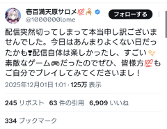引用元: 1: Vtuberまとめ2025/12/01(月) 03:53:59.68 ID:E2AreqVZ0 あんまりよくない日だったなら仕方ないね 2: Vtuberまとめ2025/12/01(月) 03:54:30.29 ID:Na8mAhtGd なにがあったんやろなぁ… 3: Vtuberまとめ2025/12/01(月) 03:56:01.78 ID:aXXbAQqpd あっふーん(察し) 6: Vtuberまとめ2025/12/01(月) 04:03:22.50 ID:Xsroe/at0 ごめんなさい 素直にコレが言えない人間の末路って感じだわなvtuberが絵畜生って言われる所以だと思うわ 7: Vtuberまとめ2025/12/01(月) 04:03:27.79 ID:o5HjzqLd0 荒らされてたの? 8: Vtuberまとめ2025/12/01(月) 04:04:07.75 ID:tTWnavN40 ワイ数年ぶりにでびの声聞いたんやが知ってるより低かったしサロメって言われて全部納得するわ なんでこれオタク同一人物必死に否定してんねん完全サロメやん 9: Vtuberまとめ2025/12/01(月) 04:07:07.05 ID:tJrfV+yE0 >>7 デビの件でサロメに凸して荒らしコメしてる糞ガイヂが大量発生してた・・ 10: Vtuberまとめ2025/12/01(月) 04:07:23.61 ID:w+P0XKjN0 >>7 ブチギレ社畜が押し寄せてきた 11: Vtuberまとめ2025/12/01(月) 04:13:18.96 ID:Cw0uxDn/0 この子だっけサラリーマンやスーパーやコンビニ店員みたいな夢や自分の人生が無い底辺労働者の馬鹿は嫌だって言ったVは 12: Vtuberまとめ2025/12/01(月) 04:14:56.62 ID:hRfzGSGt0 >>9 それ見ておサロメ様が心痛めて配信ぶち切りしたん? そんなん認めたもんやん、そしてバズりたいからやったなら自業自得やろ 13: Vtuberまとめ2025/12/01(月) 04:15:38.85 ID:hRfzGSGt0 誰かを悪く言ってバズりたいなら、誰かになんか言われる覚悟あるんだよな 14: Vtuberまとめ2025/12/01(月) 04:17:12.89 ID:XKQ1vNNV0 無事にバズれたし信者の更なる「ボクが守ってあげりゅんだあぁ!」を刺激出来たしこれ以上ない成果生み出してるやん すげーわ 16: Vtuberまとめ2025/12/01(月) 04:18:59.95 ID:huqQWxKm0 ライフライン馬鹿にしたらだめだよ 17: Vtuberまとめ2025/12/01(月) 04:20:44.56 ID:hRfzGSGt0 コンカフェスタッフしててアホほど見たわこの流れ。 泣いたら全部自分の勝ちだと思ってる、周りも同情してくれるしw 18: Vtuberまとめ2025/12/01(月) 04:24:00.40 ID:FW5F1/0l0 同一じゃないなら風評被害かわいそう…