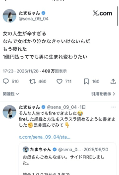 1: 2025/12/01(月) 17:08:49.18 女の人生が辛すぎるなんで女ばかり泣かなきゃいけないんだもう疲れた1億円払ってでも男に生まれ変わりたい— たまちゃん (@sena_09_04) November 28, 2025 ※関連記事 【画像】この漫画の「ダメ人間」と付き合っている彼女の話、少し怖くて草wwwww…