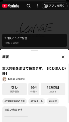 引用元: 1132: Vtuberまとめ 2025/12/01(月) 21:38:09.02 ID:bxuEn0Un あかんか… 叶@にじさんじ @Kanae_2434 (2025/12/01 21:37:27) みなさん、こんばんは 12/3(水) 22:00 に重大発表をさせて頂きます。 先んじて、Youtubeの待機所を作成させていただきましたので、是非見に来てくださると嬉しいです。 そんな気になる待機所はコチラ▽ みなさん、こんばんは12/3(水) 22:00 に重大発表をさせて頂きます。先んじて、Youtubeの待機所を作成させていただきましたので、是非見に来てくださると嬉しいです。 そんな気になる待機所はコチラ▽ — 叶@にじさんじ (@Kanae_2434) December 1, 2025 1137: Vtuberまとめ 2025/12/01(月) 21:38:37.51 ID:XZknn7X2 >>1132 ソロイベントとかかな 1140: Vtuberまとめ 2025/12/01(月) 21:38:45.14 ID:N8g3J3nP >>1132 かなかな〜😭 1143: Vtuberまとめ 2025/12/01(月) 21:38:47.79 ID:jwCHu2mY >>1132 にじGTA2どりゃああああああああああああ 1148: Vtuberまとめ 2025/12/01(月) 21:39:04.23 ID:OPMzZPA6 >>1132 CDに一票🤗 1151: Vtuberまとめ 2025/12/01(月) 21:39:06.05 ID:vhaZcuPH >>1132 るる復活の生贄になるんか… 1153: Vtuberまとめ 2025/12/01(月) 21:39:07.21 ID:nQuGyaDa >>1132 ここでこんるるどりゃするってマジ? 1156: Vtuberまとめ 2025/12/01(月) 21:39:14.01 ID:RNGemG0i >>1132 なんで二日後に発表やねん! 1160: Vtuberまとめ 2025/12/01(月) 21:39:20.44 ID:c49hih5G >>1132 告知の告知かよ😡 1161: Vtuberまとめ 2025/12/01(月) 21:39:25.42 ID:v7NO5uWG >>1132 ソロイベか やったことあったっけ 1162: Vtuberまとめ 2025/12/01(月) 21:39:27.29 ID:MwMPk4Tf >>1132 出産か? 1163: Vtuberまとめ 2025/12/01(月) 21:39:34.26 ID:qNvrvg30 >>1132 サムネで自己主張してる辺り箱企画じゃなさそう 1165: Vtuberまとめ 2025/12/01(月) 21:39:39.59 ID:JbBnd8Rj >>1132 明後日か… 1167: Vtuberまとめ 2025/12/01(月) 21:39:40.31 ID:IPM87TQ8 >>1161 ソロライブはやった 1168: Vtuberまとめ 2025/12/01(月) 21:39:43.76 ID:tS29GSSG >>1132 今日じゃなくて草 1169: Vtuberまとめ 2025/12/01(月) 21:39:44.24 ID:Q7uGcsUI >>1132 概要欄でガイガイ牽制してるのいいね 1172: Vtuberまとめ 2025/12/01(月) 21:39:50.52 ID:vhaZcuPH >>1137 2ndライブとかじゃないか 1180: Vtuberまとめ 2025/12/01(月) 21:40:09.67 ID:LkYemZDW >>1132 は?明後日かよ 今しろ! 1187: Vtuberまとめ 2025/12/01(月) 21:40:15.29 ID:oT6SJdbK >>1132 解散😩 1190: Vtuberまとめ 2025/12/01(月) 21:40:26.86 ID:Ab2fSyHR >>1132 告知の告知〜🤗 1201: Vtuberまとめ 2025/12/01(月) 21:40:52.15 ID:9Z7J3keT >>1132 3Dライブやろ? 1210: Vtuberまとめ 2025/12/01(月) 21:41:12.68 ID:VwjnqxSQ >>1132 かなかな〜🤗 佃煮のりお/犬山たまき🐶💙🌞💍のりプロ@norioo_ 【💙配信告知💙】 🐕【#かなたま重大発表】犬山たまき&かなえ先生から大切なお知らせ🎓 🐕12月2日23時〜24時 ⋱⋱ ✨かなたま重大発表✨ ⋰⋰ 犬山たまき&かなえ先生から大切なお知らせ👨🎓👩🎓 超ド級の発表をします‼��超必見です‼��💯 午後0:00 · 2025年12月1日 1215: Vtuberまとめ 2025/12/01(月) 21:41:23.69 ID:KiU5VklR >>1132 CD発売でタイアップ有とかソロライブとかそこら辺だろうな 1216: Vtuberまとめ 2025/12/01(月) 21:41:24.54 ID:JbBnd8Rj >>1210 グロ 1235: Vtuberまとめ 2025/12/01(月) 21:42:08.26 ID:o6N0IbnE >>1132 タグ的にランティス絡みが堅そう…