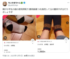 1: 2025/12/01(月) 22:02:31.48 闇深すぎる 親が小学生の娘の使用済靴下(着用画像つき)販売してるの闇深すぎるだろきしょすぎ pic.twitter.com/gJ9ZzwSEBt— ちいかまちゃん🤢 (@yukitichqn) December 1, 2025 ※関連記事 【衝撃】メルカリでレア物売る気ないのに高値で出品した結果wwwwwwwwww…