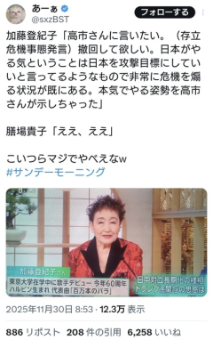 1: オールトの雲(東京都) [US] 2025/11/30(日) 12:26:57.56 ID:LEKPVpve0● BE:662593167-2BP(2000) sssp://img.5ch.net/ico/taxi.gif 引用元: ・ スポンサーリンク スポンサーリンク 20: かに星雲(やわらか銀行) [ニダ] 2025/11/30(日) 12:30:39.36 ID:5PFCM9Hr0 >>1 撤回なんてするわけないだろ 嫌ならさっさと中国に行けよ 51: エウロパ(みかか) [GB] 2025/11/30(日) 12:35:21.37 ID:erHjpwrp0 >>1 まだ煽ってる 番組終わらせろ 犯罪行為だぞ 52: タイタン(茸) [US] 2025/11/30(日) 12:35:21.49 ID:XzyXeIkn0 >>1 コイツら意味が分かってないんだと思う 297: ヒアデス星団(やわらか銀行) [GB] 2025/11/30(日) 13:58:13.15 ID:NewL70fs0 >>52 左派クにとってはトップの指示が唯一の正解であり正義だからね 疑問でも投げかけようものなら除名や総括だし 64: 火星(熊本県) [PE] 2025/11/30(日) 12:37:50.72 ID:Vnpfj6140 >>1 中国共産党人民解放軍が台湾に軍事侵攻してもいいのかな? 70: スピカ(岡山県) [US] 2025/11/30(日) 12:38:25.74 ID:TgEqfk4K0 >>1 高市批判の芸能人は大概お里が知れるな 162: アークトゥルス(東京都) [AU] 2025/11/30(日) 13:02:16.85 ID:EWVXHWAR0 >>1 撤回したらどうなるか。 平和な世の中になるんですか? 違うよ。 逆だよ。中国にとっては日本が関わらなけば 台湾攻略の難易度が下がる。 左翼の言う通りしてたら、中国は台湾に攻め込むよ。 190: ヒアデス星団(新日本) [US] 2025/11/30(日) 13:10:24.32 ID:oFb0Dsj70 >>1 ワイの論理だと 「存立危機事態」の発言撤回してしまうと むしろ逆の意味に捉えられかねない つまり「存立危機事態」の定義そのものが揺らぐのと 「台湾有事」には介入しないというメッセージにも繋がってしまう そもそも「台湾有事」発言をすればどうなるか?の シミュレーションもしていない準備不足が政治家としての力不足は明らか 更に言えばそもそも「台湾有事」の発生確率はものすごく低いのに 軽いネタ話を餌にして集客する釣りシステムに引っかかる輩が多すぎね(´・ω・`) 226: ミラ(奈良県) [US] 2025/11/30(日) 13:24:48.58 ID:R2+xhmK10 >>1 現代の世に思考をアップデートしてくれw 253: ミマス(茸) [ニダ] 2025/11/30(日) 13:34:30.50 ID:8EHAB7Or0 >>1 私は立憲民主党支持者だけどタカイチの首を習近平国家主席に差し出して立憲民主党を政権に就けないと中国の怒りを鎮めることは出来ないと日本人は知るべき 302: レグルス(光) [JP] 2025/11/30(日) 14:00:12.52 ID:6FQ4vAGS0 >>1 このひとも朝日新聞に騙されたのか? 711: グレートウォール(ジパング) [US] 2025/11/30(日) 22:40:56.91 ID:i6d7MZhD0 >>302 加藤登紀子は革マルや中核の母体となった反帝全学連のトップと結婚してんだぞ ゴリゴリの赤で朝日に騙されるどころか朝日の思想の元になったような人物だ 713: レグルス(光) [ニダ] 2025/11/30(日) 22:46:19.95 ID:K8NSfeOU0 >>711 なるほど じゃあ確信犯で「撤回しろ」と言ってるわけやね 315: イオ(日本のどこかに) [US] 2025/11/30(日) 14:07:04.39 ID:ukqYhkyW0 >>1 この人新聞の見出ししか読んでなさそう 国会中継見てないだろ 357: 青色超巨星(東京都) [CA] 2025/11/30(日) 14:28:34.32 ID:Ms18f8VP0 >>1 台湾が侵略されても見て見ぬふりしろと? 結構、残酷な人なんだな 371: エッジワース・カイパーベルト天体(東京都) [AU] 2025/11/30(日) 14:43:15.33 ID:YiX7ee7n0 >>357 お前も問題を理解してねえだろw 海上封鎖で集団的自衛権の要件(存立危機事態)を満たしたら状況次第で行使するよって言ってるだけ 日本は集団的自衛権を放棄するのか? 388: ベテルギウス(庭) [JP] 2025/11/30(日) 14:50:42.82 ID:sOnYyRLY0 >>1 コイツとか吉永小百合とか、 極左だよな 389: ソンブレロ銀河(福岡県) [ニダ] 2025/11/30(日) 14:51:57.00 ID:7a28wybZ0 >>388 吉永さんは知らないけどこの人は有名 活動家と言っても良い 394: アルファ・ケンタウリ(愛知県) [US] 2025/11/30(日) 14:57:56.97 ID:b/YdLn890 >>1 なんで平和主義者?は中国に武力行使するなと言えないの 側から見てたたらカルト宗教ですよ 464: かに星雲(日本のどこかに) [SE] 2025/11/30(日) 15:56:02.27 ID:Nuh6NYSv0 >>1 今撤回したら台湾海峡から尖閣諸島に戦艦来ても日本は無抵抗を承認したことになる。 しかも、尖閣諸島は台湾から連なっていると言う主張だから「台湾が中国の完全なる一部」になれば自動的に「尖閣諸島は台湾の一部だから中国の領土」ってロジックなんだよ 491: バン・アレン帯(やわらか銀行) [ニダ] 2025/11/30(日) 16:10:25.21 ID:vTjspVw90 >>1 日本のEEZ海域を通って台湾を攻撃しに行く行為なら存立危機になりますよね? って答えてどっか間違えてるのか? 522: カペラ(大阪府) [ID] 2025/11/30(日) 16:29:20.87 ID:VtGuiu+60 >>1 あんまりこういうこと言ってるとこの人中国のスパイなのかなって思われちゃうよ 539: ベスタ(静岡県) [PL] 2025/11/30(日) 16:45:43.60 ID:blCvzLrD0 >>1 台湾有事でシーレーンが止まったら存立危機事態で間違いないが、何を撤回しろと言うんだろう???? 「その時は武力行使する」は朝日公式Xの捏造なので高市は言ってない。つまり撤回したくてもできない。 543: 黒体放射(ジパング) [ヌコ] 2025/11/30(日) 16:48:48.16 ID:zaEly55t0 >>539 これなんでなん これまでどおり中国の主張を理解し尊重してたら日本の船は通れるだろ 551: ベスタ(静岡県) [PL] 2025/11/30(日) 17:01