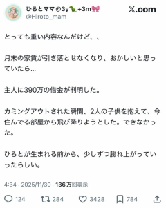 1 : 以下、?ちゃんねるからVIPがお送りします :2025/12/01(月) 14:13:19.332 ID:1lyng2Ko0.netしかも失敗は息子のせいとっても重い内容なんだけど、、月末の家賃が引き落とせなくなり、おかしいと思っていたら…主人に390万の借金が判明した。カミングアウトされた瞬間、2人の子供を抱えて、今住んでる部屋から飛び降りようとした。できなかった。ひろとが生まれる前から、少しずつ膨れ上がっていったらしい。— ひろとママ@3y🦖+4m🎀 (@Hiroto_mam) November 29, 2025転載元スレッド:…