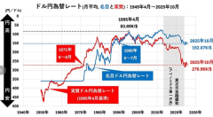 引用元: それでも動く名無し 2025/11/30(日) 12:31:52.01 ID:Gg28jqAC0 2国間の物価の変化を考慮に入れなければ、為替レートの変化が与える影響を正しく分析できないことがある。そして、この2国それぞれの物価の変化を計算に入れて名目為替レートを物価調整したのが「実質為替レート」だ。田代氏はドル円為替レートの「実質為替レート」を計算し、それを図示したのが冒頭に掲げているグラフである。 「1995年は円が“世界最強の通貨”と呼ばれました。その年の4月に1ドルは平均すると83・6円でした。この値を基準にして日米の消費者物価指数の推移を使い、ドル円の実質為替レートの推移を描くグラフを作成してみました。ただしアメリカの10月の消費者物価指数データが政府機関閉鎖の影響で未発表ですので、8月と9月とのデータを延長した値で代理しています。それを見ると10月の名目ドル円為替レートは1ドル152・8円ですが、実質のドル円為替レートは何と1ドル270・96円となります。アメリカは猛烈なインフレで物価が急騰していますから、円の購買力がさらに弱くなっていることが一目瞭然です。この270・96円は過去に遡ると、1971(昭和46)年の8月から9月の水準に相当します」 どんどん円安が進んで私たちは不安を感じているわけだが、このように新聞やテレビで「1ドル154・0円」とか「1ドル157・3円」などと報じられるドル円の為替レートは「名目為替レート」と経済学では呼ばれている。 この「名目為替レート」だけを熱心にチェックしても、円安が日本経済に与える影響を正確に測れないことがあるという。 例えば「ドル円の名目為替レート」が1ドル100円から1ドル120円と円安になったとしよう。アメリカを訪れた日本人観光客が2ドルの商品を買うとする。かつては200円で買えたものが、240円を出さなければ買えないことになる。 ところがアメリカで物価が下がり、この商品が2ドルから1ドルに値下げされたとしよう。日本人観光客は120円を出せば買うことができる。円安の影響は限定的なものになったわけだ。 2: それでも動く名無し 2025/11/30(日) 12:32:18.56 ID:2xd8PHNh0 インフレも考慮するとってことか やばいな 3: それでも動く名無し 2025/11/30(日) 12:32:33.25 ID:M4WA7mL70 こっちの方が実際の肌感に近いよな…
