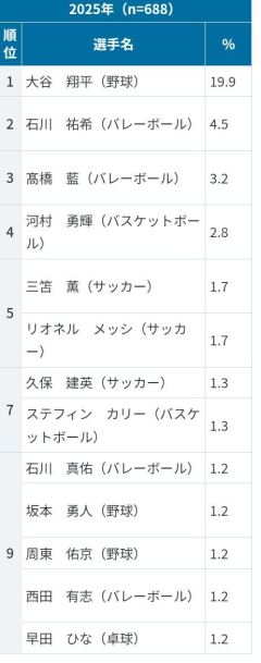 1: 以下、名無しで筋肉速報がお送りします 2025/11/13(木) 23:53:44.70 ID:Ge3itIyA9 ランキング表 大谷翔平、好きなスポーツ選手1位 19・9%で断トツ ドジャースの大谷翔平投手が、笹川スポーツ財団が12-21歳の男女を対象に実施した「好きなスポーツ選手」の調査で1位となった。 同財団が発表した。282人の名前が挙げられた中、大谷は19・9%で断トツだった。2位はバレーボール選手の石川祐希で4・5%。 調査は2年ごとに行われ、大谷は4度連続で1位。 永久保存版 大谷翔平 全本塁打パーフェクトデータブック2025宝島社2025-11-26ジュニア版 頂を目指して石川祐希徳間書店2025-08-08…