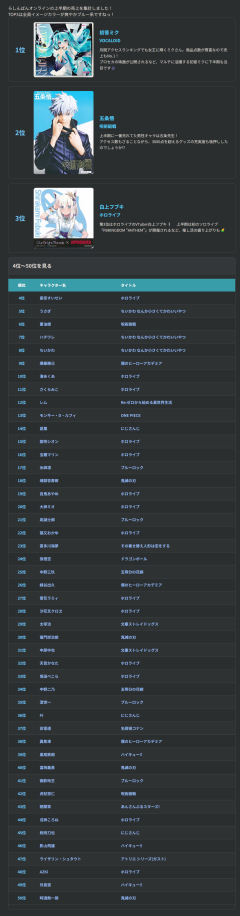 引用元: 223: Vtuberまとめ (ワッチョイW b68e-jX26) 2025/12/02(火) 16:02:05.05 ID:79jUz84t グッズはほぼ女人気で順序決まっちゃうのよな マリンとかえげつないほど売れてそう 228: Vtuberまとめ (ワッチョイ b2e5-XQ8f) 2025/12/02(火) 16:02:28.80 ID:LAcIXC8U >>223 すいせいでは 232: Vtuberまとめ (ワッチョイW c72e-03Jx) 2025/12/02(火) 16:03:33.76 ID:r7qInumN >>223 女に人気なのは小物類 缶バッジやアクスタとかね その辺買い占めて痛バや祭壇作りに使われる 233: Vtuberまとめ (ワッチョイW b68e-jX26) 2025/12/02(火) 16:03:34.75 ID:79jUz84t >>228 すいちゃんも突然売れてる みこめっとにすると何倍も売れるけど 243: Vtuberまとめ (ワッチョイW 0665-YoIt) 2025/12/02(火) 16:04:53.04 ID:lcAsmns2 >>228 すいちゃんは実はまんさんファン減ってきてる みこめっとの百合イメージ止めてくれて否定したから百合カプまんさんが反転とまでは言わんけどひっそりみんな離れていった 245: Vtuberまとめ (ワッチョイ b2e5-kI6Y) 2025/12/02(火) 16:05:13.05 ID:AS8UTCXn >>223 ほぼ決まるってほどでもないだろ 女人気弱そうなフブキござるラミィもグッズ強者だし 249: Vtuberまとめ (ワッチョイW 0665-SvBI) 2025/12/02(火) 16:05:27.81 ID:ILMDBBKu >>223 マリンのライブ男9割やったで 配信者のよく言う直近の登録者数ってのがショートやらTikTokやらからの女比率多めな流入が多いだけだろう 星街とかも男9割だろうな 254: Vtuberまとめ (ワッチョイ b2e5-XQ8f) 2025/12/02(火) 16:05:47.07 ID:LAcIXC8U >>233 中古市場ではフブちゃんが一番らしい 255: Vtuberまとめ (ワッチョイW 017b-gxj0) 2025/12/02(火) 16:06:13.10 ID:UDQhIAdI >>245 ござるって意外と女人気高いぞ 今年のフェスでござるのスカジャン着てる女かなりいた 284: Vtuberまとめ (ワッチョイW 76f9-OdvZ) 2025/12/02(火) 16:09:53.55 ID:iIR0VvYp >>254 ゲマズ全員ランクインしてて草 289: Vtuberまとめ (ワッチョイW 6e8f-gYQB) 2025/12/02(火) 16:10:03.11 ID:vMJJk7vk >>249 1割ってことは10人に1人は女ってことだろ ホロのライブでそれは結構多い気がするが 299: Vtuberまとめ (ワッチョイW 6e8f-gYQB) 2025/12/02(火) 16:11:01.75 ID:vMJJk7vk >>254 フブさんは単純に見た目が大衆受けしやすい…