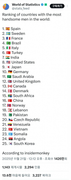 韓国ネットの反応 世界のSNSで話題になった“最もイケメンが多い国ランキングTOP25” が、韓国オンラインコミュニティでも注目を集めています。元の投稿では、世界各国の文化やメディアを分析する海外メディアが発表したリストを紹介し、この順位はどうやって決まったのか?」という疑問の声や、それぞれの国の特徴をめぐる感想が議論となりました。アジア圏では、日本が9位、韓国が25位 にランクイン。個々の評価というより、世界的なメディアの露出量が影響したと見られています。この記事へのコメントはこちらからお願いします。…