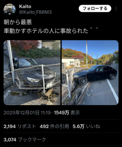 1: 2025/12/02(火) 16:48:40.83 朝から最悪車動かすホテルの人に事故られた^^ pic.twitter.com/fPpHGXVCSf— Kaito (@Kaito_F80M3) December 1, 2025 ※関連記事 【画像】この漫画の「ダメ人間」と付き合っている彼女の話、少し怖くて草wwwww…