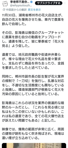 中国湖南省の花火店主が自宅件店舗を爆破、その後車内で農薬を飲んで死亡