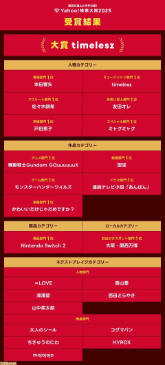 1: 2025/12/03(水) 00:22:13.72 ID:vVzEL1mw0 “Yahoo!検索大賞2025”商品部門でNintendo Switch 2が1位に。『モンハンワイルズ』『ガンダムジークアクス』がゲーム部門・アニメ部門で首位を獲得 2: 2025/12/03(水) 00:22:36.58 ID:vVzEL1mw0…
