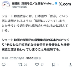 【悲報】有識者VTuber「ショート動画依存はマジヤバい。ゲームすらできない廃人になります」