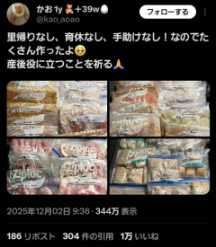 1: 2025/12/03(水) 18:00:03.73 里帰りなし、育休なし、手助けなし!なのでたくさん作ったよ🥹産後役に立つことを祈る🙏 pic.twitter.com/3lKglUneP9— かお 1y 🧸+39w🥚 (@kao_aoao) December 2, 2025 ↓ ※関連記事 【画像】この漫画の「ダメ人間」と付き合っている彼女の話、少し怖くて草wwwww…