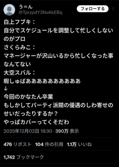 引用元: 405: Vtuberまとめ2025/12/04(木) 07:53:18.88 あの、表でも派閥の発言まとめが1万いいねいってます… しかも引リツでも同意されてるのでこーれマズイっすw 419: Vtuberまとめ2025/12/04(木) 07:53:37.21 >>405 あっ 420: Vtuberまとめ2025/12/04(木) 07:53:46.57 >>405 爆伸びしてて草 429: Vtuberまとめ2025/12/04(木) 07:54:00.30 >>405 もう完全に表は派閥のせいってなってるな ざまあみろ 454: Vtuberまとめ2025/12/04(木) 07:55:05.63 >>405 答え合わせ完了やね 462: Vtuberまとめ2025/12/04(木) 07:55:20.29 >>405 くだらない印象操作だな 470: Vtuberまとめ2025/12/04(木) 07:55:37.45 >>405 まあ今まで辞めてたのは明らかに不真面目勢やったからな 真面目なたそが辞めたからには派閥の存在は認知されますでしょうね✋ 476: Vtuberまとめ2025/12/04(木) 07:55:47.81 >>405 かなたの配信すら見てないクズやん…